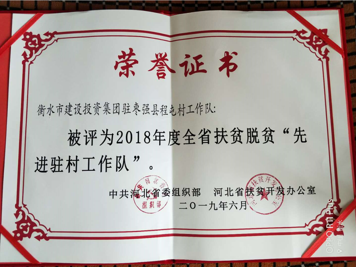 衡水市建設(shè)投資集團(tuán)有限公司駐衡水市棗強(qiáng)縣棗強(qiáng)鎮(zhèn)程屯村駐村工作隊(duì),自20183月駐村以來,立足程屯村貧困實(shí)際,按照習(xí)近平總書記關(guān)于精準(zhǔn)扶貧、精準(zhǔn)脫貧的要求,堅(jiān)持一切從實(shí)際出發(fā)、因地制宜,堅(jiān)持科學(xué)謀劃、穩(wěn)步推進(jìn),堅(jiān)持問題導(dǎo)向、強(qiáng)化責(zé)任擔(dān)當(dāng),扎實(shí)有序推進(jìn)程屯村扶貧各項(xiàng)工作。先后投資70余萬元,完成改造道路、擴(kuò)建魚塘、安裝路燈、修建籃球場(chǎng)、綠化美化等實(shí)事好事,村容村貌明顯改善,村民幸福指數(shù)明顯提升,受到市縣鄉(xiāng)領(lǐng)導(dǎo)的充分肯定和廣大村民的一致好評(píng)。2018河北省扶貧開發(fā)和脫貧工作領(lǐng)導(dǎo)小組授予“脫貧攻堅(jiān)先進(jìn)集體稱號(hào),2019年年度七一表彰中,再次被河北省委組織部和河北省扶貧開發(fā)辦公室授予2018年度全省扶貧脫貧“先進(jìn)駐村工作隊(duì)稱號(hào)。